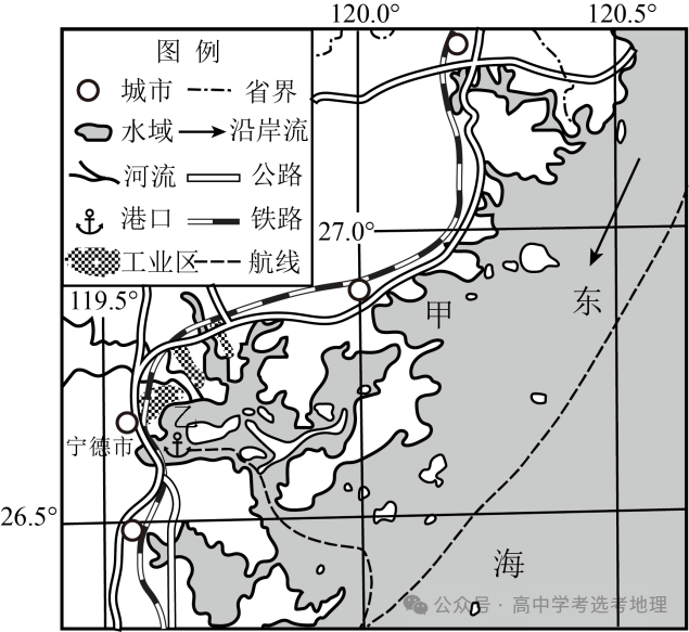 季的沿岸流,分析其淤泥质滩涂面积广阔的主要原因。(2)评价乙海湾建港的自然条件。