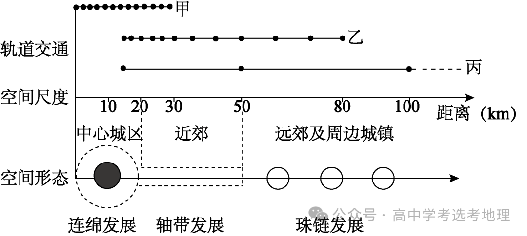 4.B【分析】3.根据图示信息可知◆■■★★◆,甲轨道交通主要联系中心城区和距离中心城区较近的近郊■★◆■◆,且站点密集★★,应为市区地铁;乙轨道交通主要联系中心城区★◆◆■■◆、近郊和距离中心城区较近的远郊及周边城镇,因为市郊铁路◆◆◆;丙轨道交通站点较少◆■,且延伸距离较远,应为高速铁路,A正确★■◆,BCD错误。所以选A。