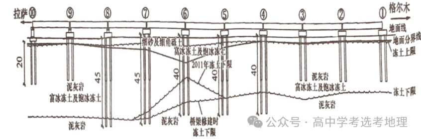 600m★◆■。该路段以固态降水为主,且地处高温高含冰量多年冻土区★★,旱桥的每个桥墩由四个单桩组成的桩群来支撑桥面■■◆★★。下图示意青藏铁路某段旱桥纵剖面。完成下面小题。4.建设旱桥的最主要目的是(