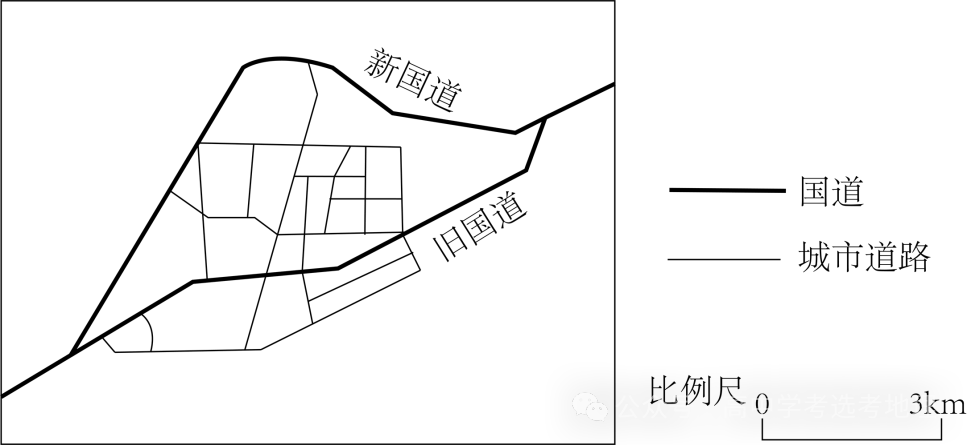 近十几年来,随着经济发展和家用汽车普及,我国区域公路干线(国道或省道)在经过平原地区县城时,一般经历从穿城到绕城的变化★★■★■★。下图示意经过某县城的国道布局变化,其中新国道建成通车后★■,旧国道转为城市道路■■★◆★◆。据此完成下面小题。